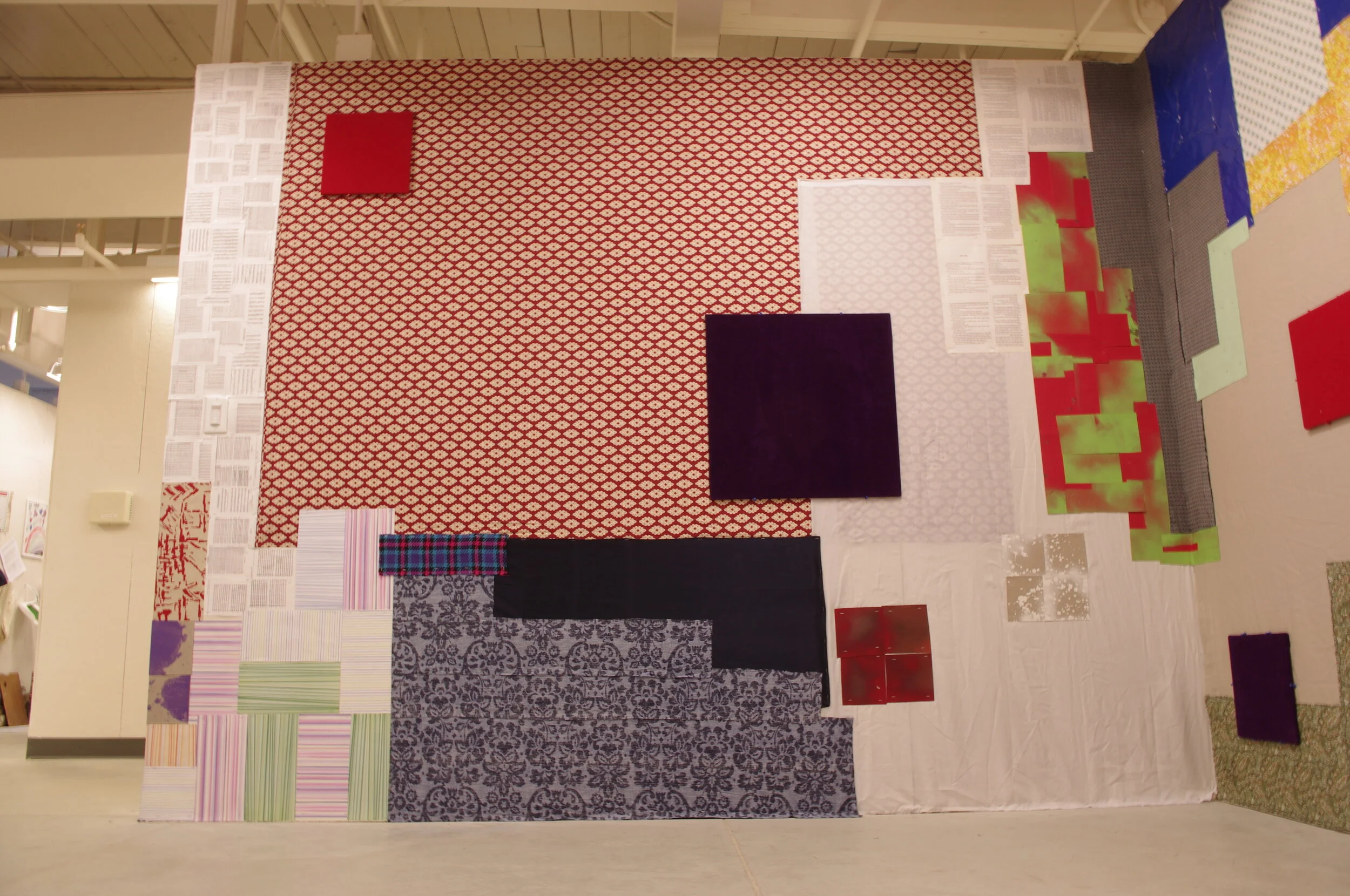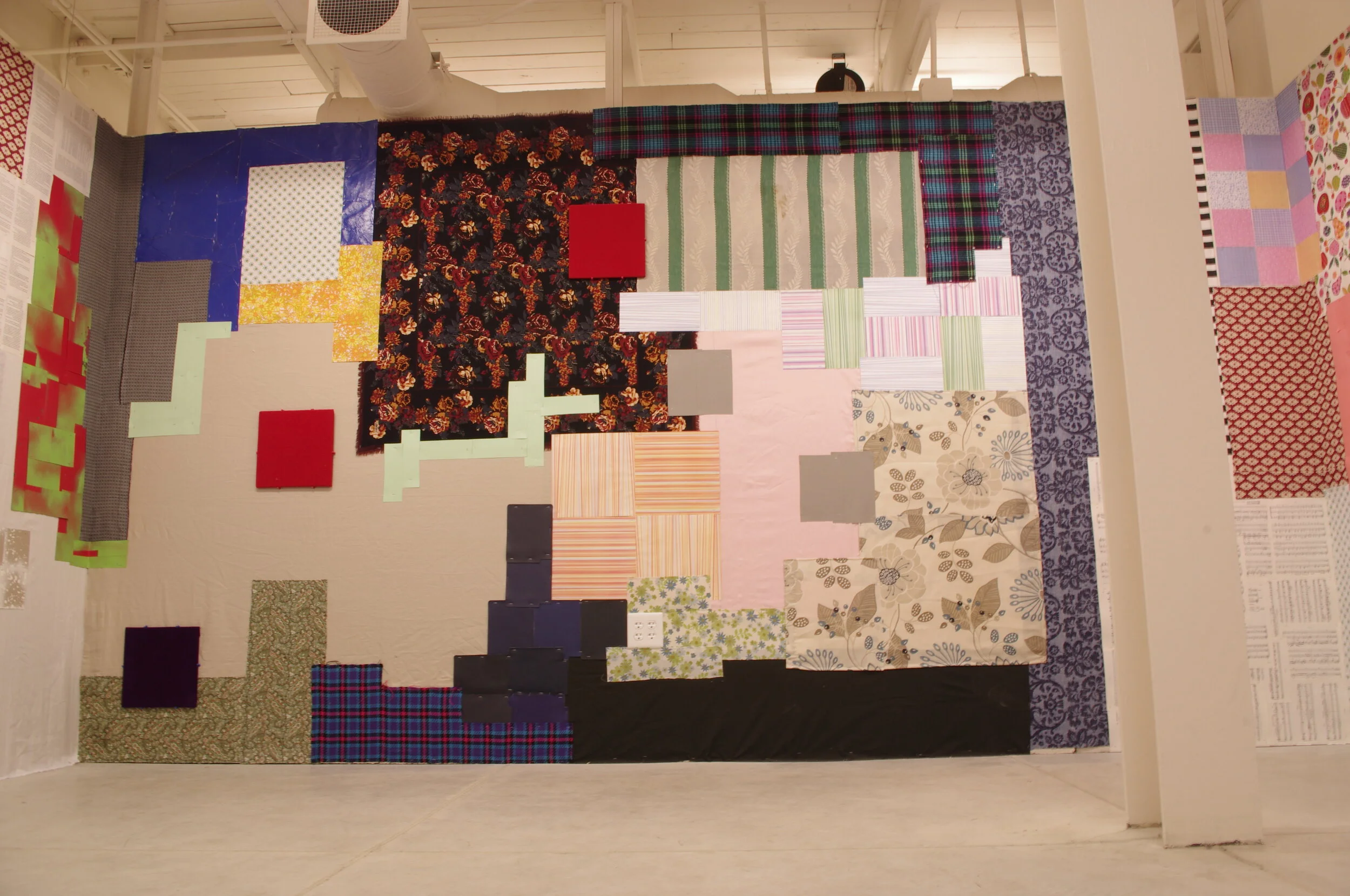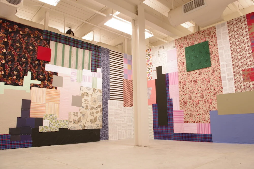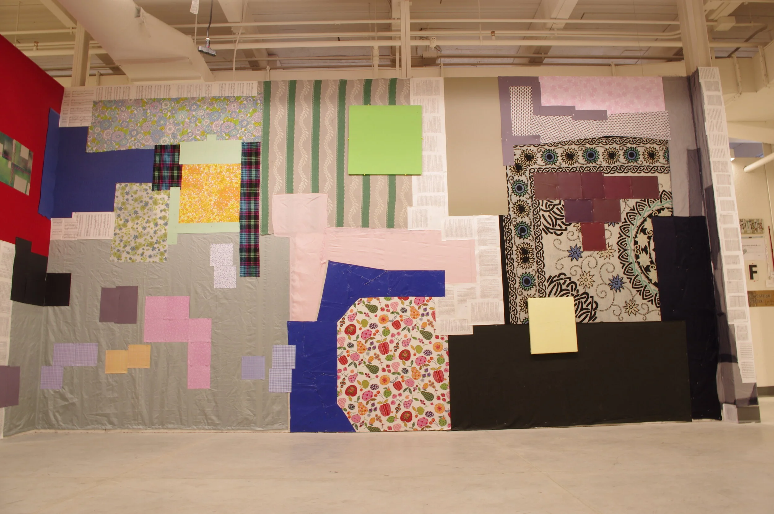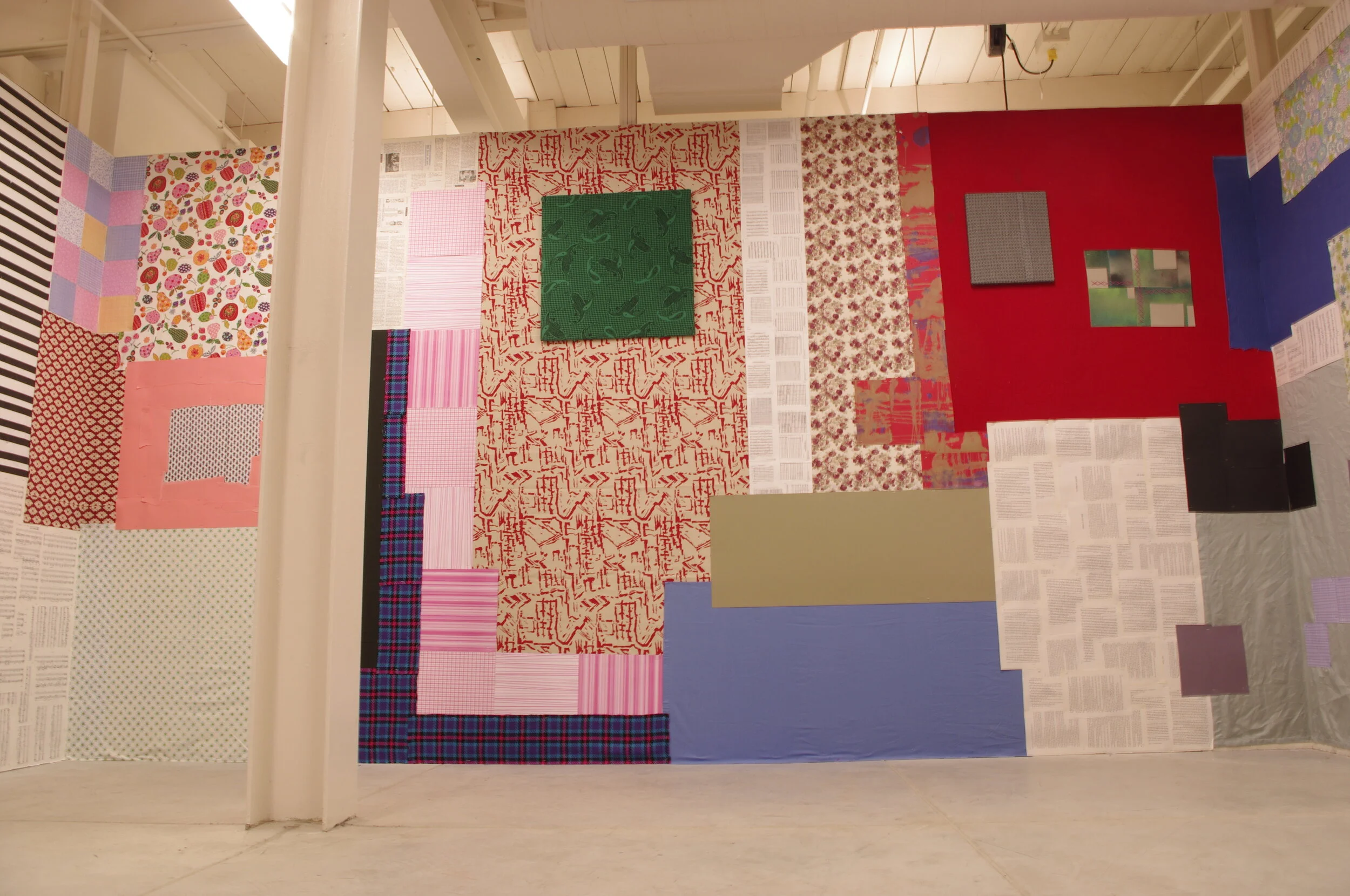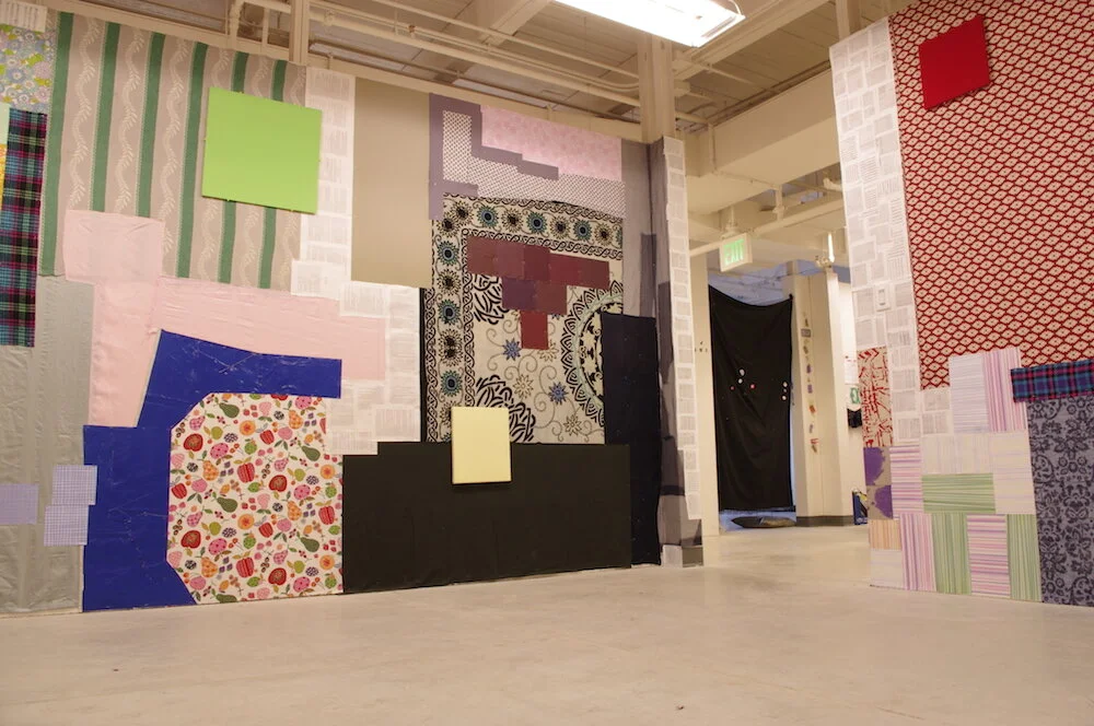 QUILTSTALLATION | In 2012, for the first time ever, I was able to explode my fabric collection onto the walls of a project space. This installation environment was made using reclaimed fabric, paper, sheet music, and painted cardboard. It served as the site of my first group critique, a dance video backdrop, and a space of solitude.